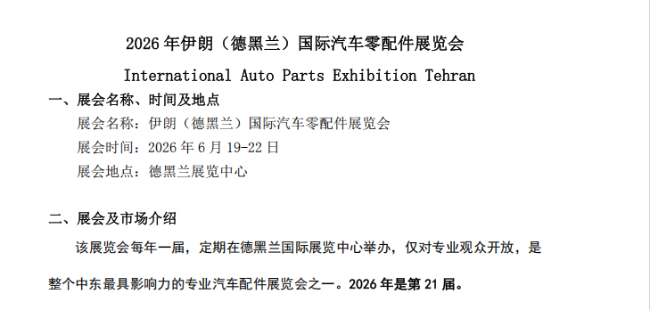 2026 年6 月 19-22 日伊朗(德黑兰)国际汽车零配件展览会
